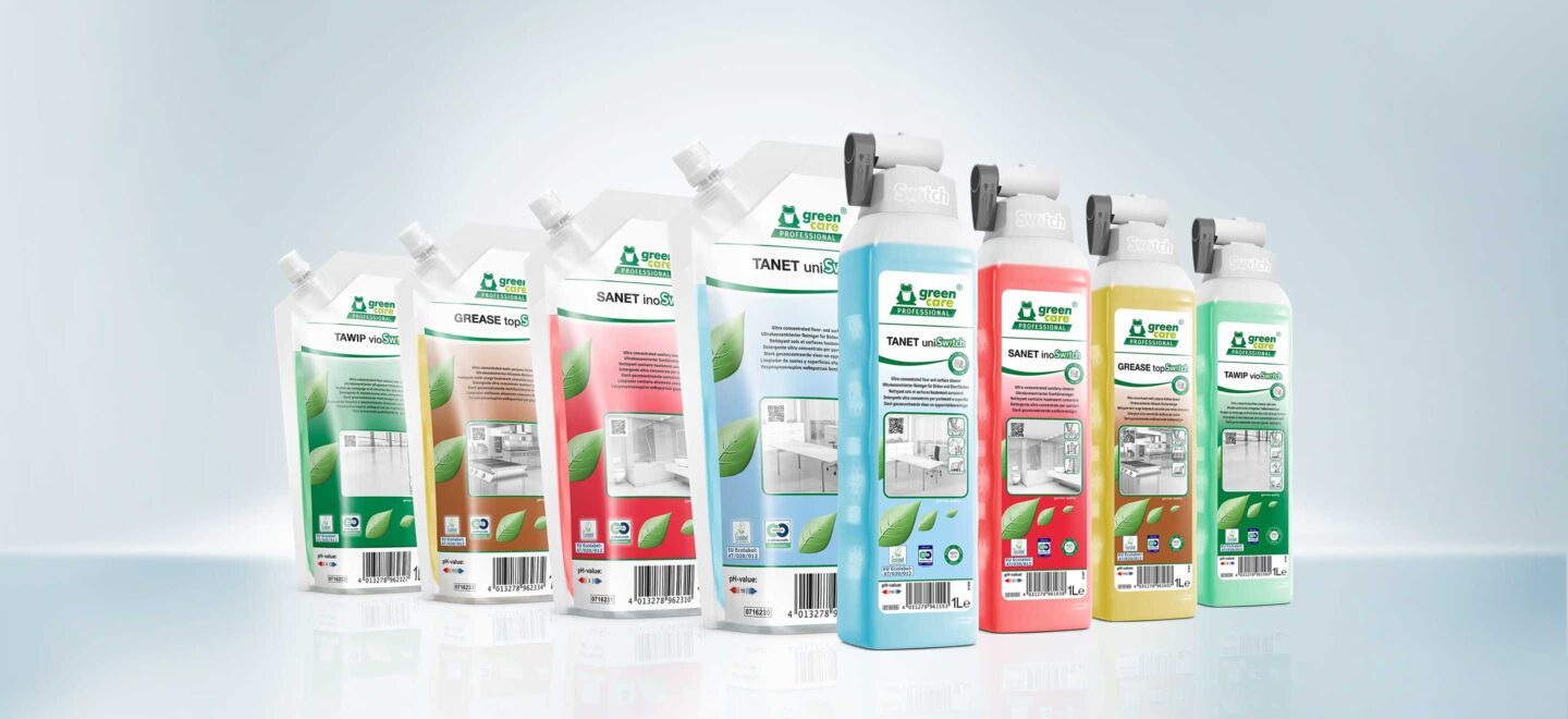 Unser innovatives Switch System kombiniert effiziente und sichere Dosierung ohne weiteres Equipment mit den Vorteilen des nachhaltigen und kostengünstigen Nachfüllens. Es stehen ultrakonzentrierte Rezepturen für vier verschiedene Anwendungsbereiche zur Verfügung, die höchsten Nachhaltigkeitsanforderungen entsprechen.