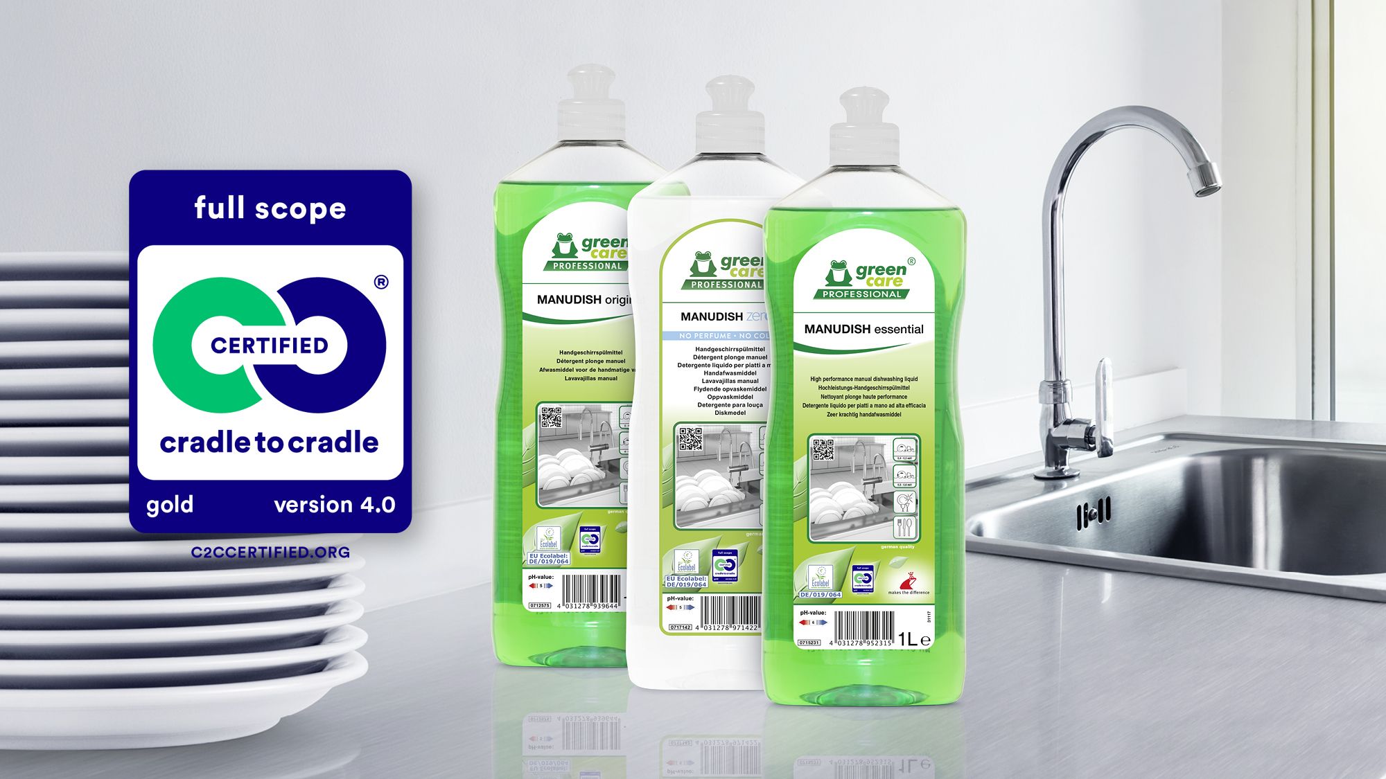Rekord: Als erster Reinigungsmittelhersteller weltweit hat die Tana-Chemie GmbH mit ihren Produkten den anspruchsvollen Cradle to Cradle Certified® Standard 4.0 mit Full Scope Gold erreicht. MANUDISH essential, MANUDISH original und MANUDISH zero% erfüllen damit höchste Ansprüche an Materialgesundheit, Kreislauffähigkeit, Klima- und Ressourcenschutz sowie soziale Verantwortung.