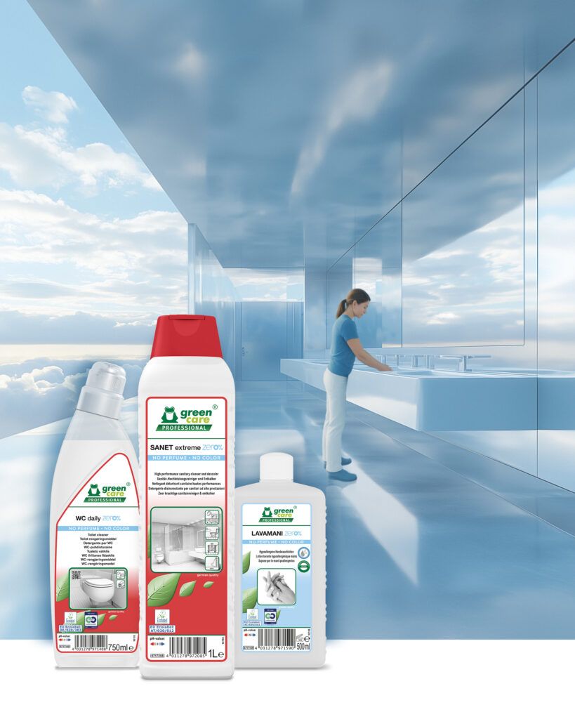 Insgesamt decken 14 zero%-Produkte alle Anwendungsbereiche der professionellen Gebäudereinigung ab. Für den Sanitärbereich stehen WC daily zero%, SANET zitrotan zero%, SANET perfect zero%, SANET extreme zero% und SANET alkastar zero% zur Auswahl. Universelle Oberflächenreiniger wie TANET SR 15 zero%, und der neue TANET multitan zero% eignen sich für vielfältige Aufgaben der Gebäudereinigung. Mit TANET karacho zero% und dem TANET karacho Spray zero% kommen zwei besonders effiziente Oberflächenreiniger ins Sortiment, gefolgt von der Wischpflege TAWIP vioclean zero%. Das Handgeschirrspülmittel MANUDISH zero% wird durch die milde Handseife LAVAMANI zero% vervollständigt. Auch im praktischen Quick & Easy Sortiment zur mobilen Anwendung können für den Sanitärbereich und die Oberflächenreinigung duft- und farbstofffreie Produkt gewählt werden: SANET daily zero% Q&E und TANET interior zero% Q&E. Alle Produkte sind im gleichen Preissegment wie die übrigen Green Care-Lösungen angesiedelt und bieten so eine attraktive und nachhaltige Alternative ohne Mehrkosten