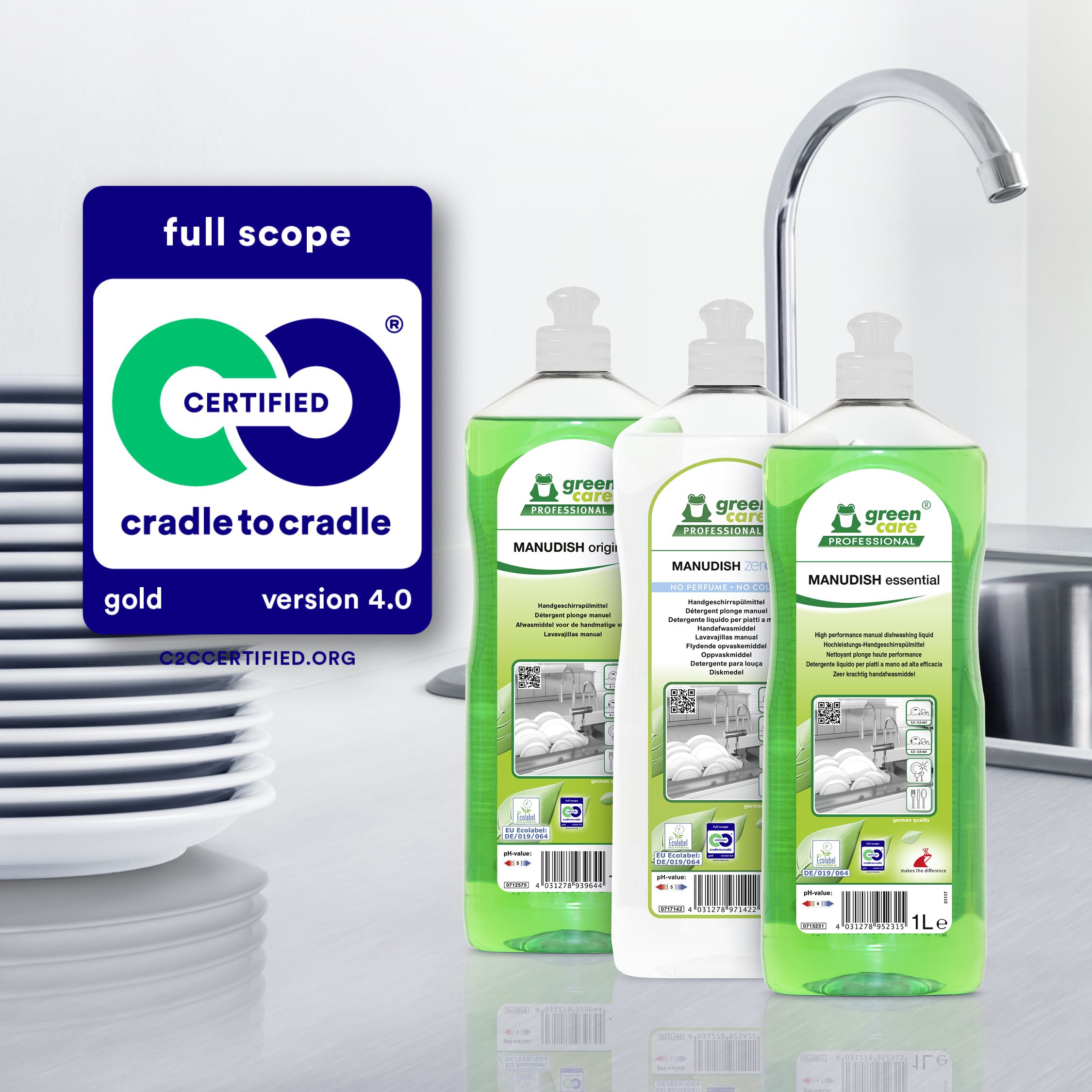 Récord mundial: Werner & Mertz Professional es el primer fabricante de productos de limpieza del mundo en obtener la certificación Cradle to Cradle Certified® 4.0 Gold Full Scope. Los productos MANUDISH essential, MANUDISH original y MANUDISH zero% cumplen con los más altos estándares de seguridad de materiales, economía circular, protección del clima y los recursos, y responsabilidad social.